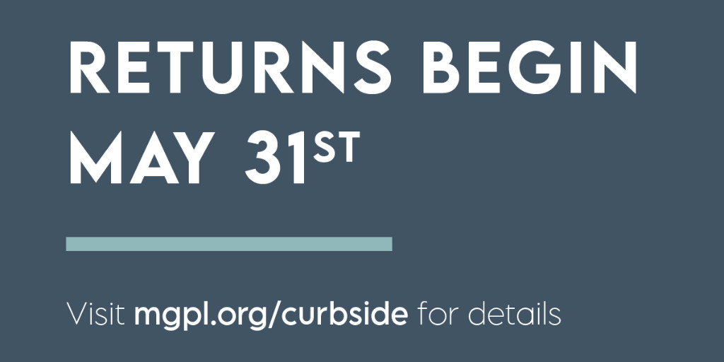 This service will be available on Tuesdays, Thursdays, and Saturdays by appointment and is only available for MGPL items. More information about pickup will be available soon at mgpl.org/curbside.