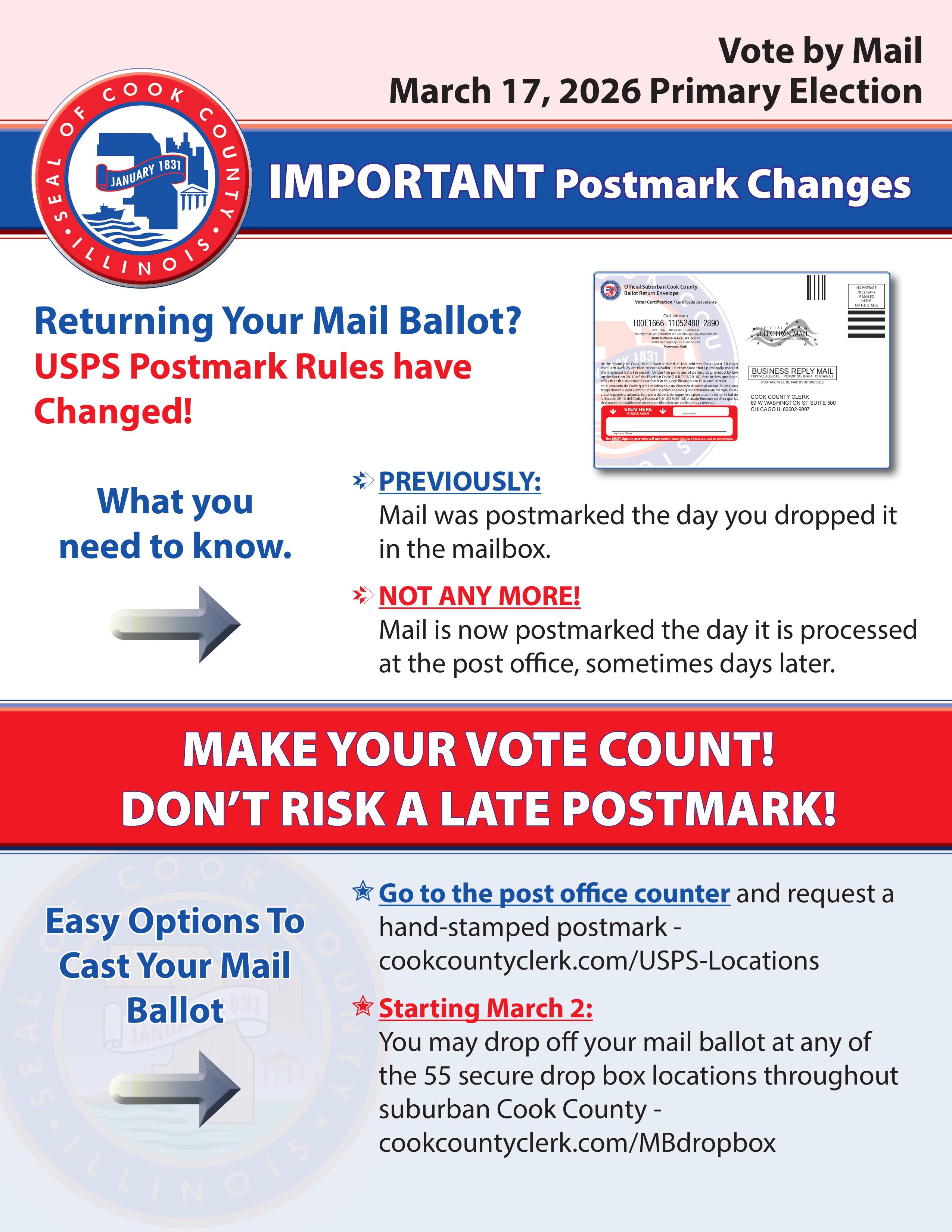 March 17, 2026: Primary Election Day! Polls are open from 6:00 am to 7:00 pm.